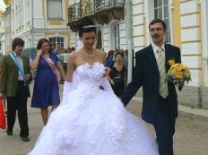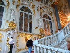 | ロシアの旅10 2008年7月12日(土)-10日目 昼食後、ペテルゴーフという所にある夏の宮殿へ行った。北方戦争に勝利したピョートル大帝が大国ロシアに相応しい宮殿をと、パリのベルサイユを真似た大宮殿を建築。その後歴代の皇帝により磨きをかけられたが、第2次大戦でドイツ軍によって破壊された。今は修復されて世界遺産になっている。破壊された直後の写真や修復中の写真が廊下に飾ってあったが、よくもここまで修復したと感心してしまう。 午前中に訪れたエカテリーナ宮殿とこんがらかってくるが、ここにも儀式の階段・ダンスの間・戴冠の間・大玉座の間・食堂・中国の間・肖像が368枚もある絵画の間など豪華な部屋が延々と続く。 この宮殿をより有名にしているのは、涼しげな水を噴き上げている噴水だ。もともとピョートル大帝は海からテラス状に高くなる地形に注目し、水を活かした宮殿を作ろうとした。宮殿のテラス前にある大滝には、37体の金色像、64の噴水、142の水の吹き出し口がある。これらの水が中央の階段を通って運河や海に流れ込んでいる。