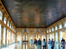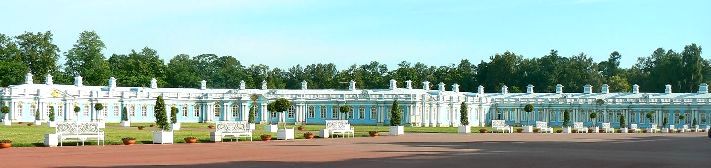 <サンクトペテルブルグのプリバルチスカヤホテル泊> 7月12日(土)-10日目 今日はサンクトペテルブルグ郊外にある2ヵ所の宮殿を見に行く。まず南に25qにあるツアールスコエ・セローのエカテリーナ宮殿へ。1724年ピョートル大帝の妃・エカテリーナ1世のために建設。エリザベータ女帝のときにバロック様式で改築、エカテリーナ2世の時代にもクラシック様式で改装された。 青い外壁と金色の装飾が涼しげに思える宮殿(上)だ。横に長い宮殿で、1枚の写真に収まりきらない。入り口で音楽隊の演奏が迎えてくれた。ロシアの人達には音楽が根付いているのか、ここ以外でもコーラスや楽器の演奏に何度も出会った。 儀式用の階段を上がると、西側に寝ているキューピット像・東側に目覚めのキューピット像があった。表情がかわいらしい。大広間・大玉座の間・豪華な食堂・赤い間・緑の間・琥珀の間・130枚の絵画が飾られた絵画の間など55もの部屋を見て歩いた。