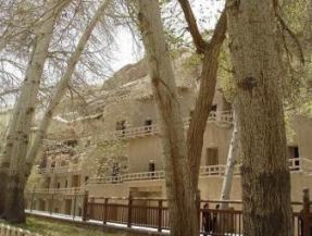 | 中国シルクロードの旅 3 2005年4月20日(水)−3日目 いよいよ本物の莫高窟の見学だ。右のような窟が延々と続いている。混み合っている時は、窟に入るにも、外で待たねばならない。夏に外で待っていると、太陽の日差しで参ってしまうこともあるそうだ。ただし、窟の中は、ヒンヤリしている。今回は、シーズンの幕が開いたばかりで、他の団体とかち合うことはなかった。