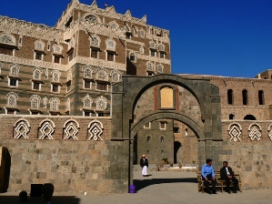 ドーハの豪華な空港に比べると見劣りするが、「はるばる来たぜーイエメンに」と口ずさみたくなる長閑な空港だ。標高2300bにあるので少し肌寒い。 2月24日(火)−3日目 いよいよイエメン観光が始まる。私の旅先候補にイエメンはなく、アラビア半島の国という認識しかなかった。イエメンの首都すら知らなかった。ガイドブックにはサナアと出ているが、そのサナアすらサアナと言い間違える始末。モロッコとイスラエルとインドで一緒だった旅友のHさんに誘われての旅だったが「行ってよかった〜」と思っている。 帰国直後の3月15日に、世界遺産の町シバームで韓国人観光客4人とイエメン人ガイド1人が死亡した(左)。テロがあったのは「砂漠の摩天楼」と言われるシバーム(上の地図参照)を見下ろせる場所で、私たちも2月27日に訪れたばかりだ。襲われた時刻をみると、夕日に染まるシバームを見学する最中だったと思われる。 日本の新聞には報道が少ないからはっきりしないが、アルカイダによるテロという見方がもっぱらだ。アルカイダは、2004年から米国・英国とともに韓国を攻撃ターゲットに挙げている。韓国がイエメンに近いソマリアに「清海部隊」を派遣したことが、アルカイダを刺激したのだと。無差別だったのか、韓国人を狙ったものかわからないにしろ、私たちが危機一髪だったことは確かだ。「危ない国に行ったのだなあ」の思いはあるが、イエメンにいた10日間はテロの予感すらなかった イエメンは西は紅海・南はアデン湾に面し、オマーンとサウジアラビアと国境を接している。面積は日本の1.4倍、人口は約2200万人。アラビア半島の国はオイルマネーで潤っている国が多いが、イエメンだけはその繁栄から取り残された最貧国である。そのこともあって、サウジアラビア・カタール・アメリカ・イギリスへの出稼ぎ者や移民者が約100万人もいる。 首都サナア観光の手始めは、国立博物館(左)。1962年までイマーム(イスラム教最高指導者)が住んでいた宮殿だけあり、外観や内部にもそれを感じさせる。日干しレンガに白い漆喰の窓枠がついたイエメン独特の建築だ。1962年はイエメンに革命が起こった年なので、1962という数字はこれからも何度も耳にすることになる。 イエメンの歴史を知らない私には、博物館の展示を見てもよく分からない。事前に勉強してこなかった罰が初日に表れてしまった。後に知ったイエメンの歴史をざっと書いてみる。もっとも紀元前の記述は書物によって違いがあり、どれが真実なのかわからない。 サナアは、「ノアの方舟」のノアの息子セムが最初に住み着いた所だとイエメン人は信じているが、ノアは旧約聖書の登場人物だから、歴史上の人物とは言えない。紀元前10世紀以前から南アラビア文明が栄えたという。エジプトとメソポタミアに挟まれた地域だから文明が栄えたというのも頷けるが、確固たる証拠はないようだ。 9世紀頃からイスラム教ザイート派(シーア派)の宗教指導者が支配。16〜17世紀はオスマントルコが支配。1918年にイエメン王国がトルコから独立。 1962年に革命が起こりイエメン・アラブ共和国(旧北イエメン)樹立。1967年にイギリスから南イエメン人民共和国が独立し、7年後に共産主義政権のイエメン民主人民共和国(旧南イエメン)樹立。しばらく南北に分裂していたが1990年に南北が統一しイエメン共和国が成立した。 イエメンが統一したのは、東西ドイツの統一や社会主義国の崩壊とほぼ重なる。偶然ではないような気がする。 本題に戻る。古代王国時代の展示物もあったが、歴史を知らないうえに写真撮影も禁止だったので印象に残っていない。オイルランプだけはよく覚えている。アラビアンナイトの「アラジンと不思議なランプ」のランプはこんなだったのだなあと、ただそれだけのことだが、旅行会社のパンフレットにある「アラビアンナイトの世界」を垣間見て嬉しかった。 博物館を見ている最中に、日本人が珍しいのかイエメンの記者から取材を受けた。着いたばかりだというのに「イエメンの印象は」など聞いてくる。イエメンだけで7回目という添乗員さんが「時の流れがゆっくりしているのが良い」など答えていた。観光を促進していこうという意気込みを感じたが、なにより旅行者の安全を確保してくれないと困る。 博物館の外側に大きな人物写真がかかげられてあった。今後たびたび目にすることになる64歳のサレハ大統領の肖像(左)だ。共産主義時代の毛沢東の肖像のようにあちこちに掲げられてある。大統領職に28年間。その前から権力者だったというから30年以上も権力を握っている。こうも長いと他の人は意見を言えないのではないかと他国ながら心配だが、2007年の直接選挙でも80%の支持を集めたという。ガイドのシャーミーさんも尊敬していると話していた。今日のお目当ての旧市街(左)に入った。東西1.5`南北1`の旧市街は、高さ12bの城壁で囲まれている。サナアの人口は150万人だが、旧市街にも5万人が住んでいる。 旧市