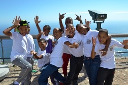 黒人の小学生が来ていた。子どもはどこの国でも無邪気だが、彼らは底抜けに明るい。カメラを向けると、はじけるような笑顔でポーズをとってくれた。ありきたりのピースなどではなくカッコいいポーズだ。服装も持ち物も小ざっぱりとしていて、良い階級の子どもたちだという。「顔つきを見ても違うでしょう」と阿部さんに言われてしまった。このように黒人の中でも貧民街に住む層と裕福な層の格差社会が出来ている。マンデラさんが望んだような理想的な国にはほど遠いらしい。山を下りる頃には雲が出てきた。頂上が真平に見えるのでテーブルマウンテンと言うのだが、そこに雲がかかった状態をテーブルクロスという。ケーブルで降りてきた山を見上げると本当に白いテーブルクロスを敷いたように見えた。