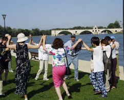 | 南フランスの旅 5 学校で習ったわけでもなく、親から教えられたこともないのに、なぜか知っている歌はいくつかあります。フランス民謡の「♪アヴィニョンの橋の上で輪になって踊ろよ、踊ろよ・・♪」もそのひとつ。アヴィニョンがフランスの地名だと知らない頃から、口ずさんでいました。 観光スポットを隈無く回るのが、パッケージツアーなので、アヴィニョンの橋も、遠くからと、至近距離から見物しました。眺めるだけでは面白くないだろう・・の現地ガイドの配慮?もあって、輪になって踊らされてしまいました。「橋の上で輪になって踊る」ほど、橋幅が広いはずもなく、川辺での踊り。 正式には「聖ベネゼ橋」というこの橋が建設されたのは、12世紀ですが、ご覧のように橋は途中で切れたままで、橋としての機能を果たしていません。 この橋がかかっているローヌ川は、「きちがい牛」と呼ばれる暴れ川。冬は、地中海地域特有の豪雨が降り、春から初夏にかけては、アルプスの雪解け水で、一気に水量が増すそうです。 何度も修復しようとしたが、そのたびに「きちがい牛」に阻まれたので、そのまま放置した・・と、本にはあります。水道橋を造ったほどの民族の子孫が、たかが普通の橋を修復出来ないはずがなく、単にやる気がないか、話題性のために、そのまま置いてあるとしか思えません。 訪れた時の流れは実に穏やか。きちがい牛の片鱗もありませんでした。「なんだ!こんな橋」と、思いましたが、見なければ見ないで、残念だったにちがいありません。なにしろ「アヴィニョンの橋」ですもの。 歌は、世界中に知られているわりには、いつ誰が作ったか不明。バレー「ジゼル」で有名な19世紀の作曲家アドルフ・アダンがコミックオペラの中で使いました。それが大ヒットして、世界中に広まったとか。橋が出来てからおよそ700年後のことです。 ところで、この歌の中盤の歌詞に「・・♪坊さんが通る・・♪」とありますね。「坊さん」と言えば、墨染めの衣を身につけた坊主頭を思い浮かべていまいます。 どうして日本の坊主が、アヴィニョンの橋を通るんだろう?アヴィニョンという洒落た響きと、「坊さん」のイメージのギャップに悩んだ方は、いませんか。 「坊さんが通る・・」を「神父さんが通る・・」と訳してくれれば、違和感に悩むこともなかったのです。ま!いずれにしろ、本気で悩んだわけではありませんが、アヴィニョンは、橋よりも、法王庁が置かれていたことで、歴史上名高い地。詳しくは次の項で。 感想・要望をどうぞ→ 南フランスの旅 1へ 次へ ホームへ |