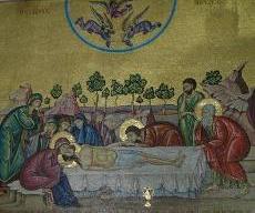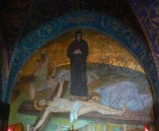 ゲッセマネの園に隣接して、万国民の教会(地図B)がある。1925年に世界12ヶ国からの献金で建てられたので、この名がある。外壁は明るいモザイクで飾られているが内部は暗い。イエスが苦悩の夜を過ごした場所なので、暗くしているそうだ。