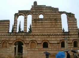 | ヨルダン・シリア・レバノンの旅 17 2005年1月23日(日)-13日目 レバノンが誇る世界遺産のバールベックとアンジャール遺跡を見学する日。昨日とは比べようもない強い雨が降っているが、予定通り、ホテルを出発した。 ![]() モニュメント側に、レバノンを17世紀に統治したファカルディーンの騎馬像(左)があった。ブラジルに移民したレバノン人が建立したという。現在のレバノンの人口は約300万人、ブラジルには約700万人のレバノン人が住んでいる。「国ってなんだろう」と、考えてしまった。 バールベックは、ベイルートの北東・86qにある遺跡。日本の赤軍派が拠点にしていたベッカー高原のほぼ中央に位置している。赤軍派が活動していたころに盛んに耳にしたベッカー高原だが、実は、レバノン最大の肥沃地帯で、果物・小麦・大麦、野菜の産地である。 しかし、高原を通る道路が中東5ヶ国(ヨルダン・シリア・レバノン・イラク・サウジアラビア)の国際通りになっていることもあり、峠付近に検問所がある。そうでなくても、ホメイニ師やヒズボラ(神の党)の旗がヒラヒラしていて、緊張地帯だったことを思わせる。今は、危険地帯に指定されていないが、いつなんどき事件が起きても不思議がないのかもしれない。 エジプトでも、切りかけのオベリスクを見たが、同じようなものだ。写真の左奥にバールベック遺跡、少し右にイスラム寺院の青屋根が見える。 雨風がますます激しくなった中で、バールベック遺跡の見学。フェニキアの豊穣神バールと、場所を意味するベックからこの名がついている。もともとはフェニキアの神殿だったが、支配者が変わったことで、ギリシャ時代は太陽神、ローマ時代は多神教の神殿に変わった。 右は、添乗員がくれたバールベックの復元図。ビーナス神殿は、道路をはさんで手前にあるので、この図にはない。ジュピター神殿は、世界最大規模の神殿。高さ22.5b、直径2.2bの柱が54本もあったが、今は6本のみ。8本はトルコのアヤソフィアを作った時に持ち去られたというが、他の40本はどうしたものやら。 傘を差しての撮影は不便だが、各ポイントごとに、一応カメラにおさめた。左はクレオパトラ像。蛇が巻き付いていることから、クレオパトラだと言われている。波打っているのは、ナイル川。 昼食の間に、「峠が雪で閉鎖されるかもしれないから早く下りるように」の情報が入った。遺跡は海抜1200b、峠は海抜1500bの地点にある。早々と引き上げた。 ここも強い風雨の中での見学になった。旅行会社は勝手に省くわけにはいかない。世界遺産ゆえに、楽しみにしている人がいるかもしれない。バスの中にいても良いと言われたが、残ったのは数人だった。誰もが、再び来ることはないだろうと思っているからだ。 <ベイルートのマリオットホテル 泊> (2005年12月16日 記) 感想・要望をどうぞ→ ヨルダン・シリア・レバノンの旅1へ 次(フェニキア時代に栄えた都市)へ ホームへ |