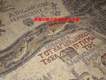 749年の地震で壊れ、今は10b×5bと小さくなったが、イスラエル・死海・ヨルダン川などが描かれている。ヨルダン川を死海に向かって泳いでいた魚が、塩分が濃いので、直前で戻ってしまう場面(左)が面白かった。