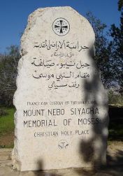 先月亡くなったローマ法王・パウロ2世は、2000年にネボ山を訪問している。記念のモニュメント(左)には、ギリシャ語・ラテン語・アラビア語で、神の愛と平和の文字が記されているという。同じ神を信仰するユダヤ教徒・イスラム教徒・キリスト教徒に、平和が訪れるようにのメッセージだ。