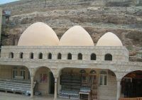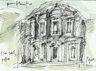 | ヨルダン・シリア・レバノンの旅 6 2005年1月14日(金)-4日目 昼食後、山の頂上にあるエドディル(修道院)に向かった。1時間の山登りをしないとエドディルには着かない。添乗員のMさんが「みなさん!頑張ってエドディルまでいきましょう!」と、朝から鼓舞していたのは、こういうことだったのだ。 登りながら後ろを振り返ると、ごつごつした岩山が連なっている(上左)。緑がほとんどない山登りは、はじめてだ。ときどき黒い山羊が集団で通る(上右)。岩から岩を軽快な動きで飛び跳ねている。岩山ばかりなので食べ物の在処が気になるが、人間サマの知らない所にあるのだろう。 「あと○○分」と励ましてくれるのは、ネックレスや遺跡のレプリカを売っているベドウィン人だ。声をかけてくれるだけで、モノを売りつけようとしないのがいい。馬や驢馬をあやつっている御者も、ベドウィン人。砂漠の民だったベドウィン人の中には、近代国家後も、砂漠地帯で暮らす選択をした人もかなりいるようだ。 エドディル(上左)は、一見するとエルカズネに似ているが、一回り大きい。高さ50b、横40b。ナバティア人がAD1世紀に建立した神殿だったが、ビザンチン時代には教会として利用された。修道士が住んでいたので、エドディル(修道院)と呼ばれるようになった。 日本画家のMさんに「白川さんがいちばん気に入った所はどこ?」と帰国前日に聞かれたので、「ペトラ遺跡かなあ」と答えた。スケッチブックからエドディルを描いた1枚(上右)を切り取り、Dear Harukoと自分の署名をいれて、無造作に手渡してくださった。 <ペトラのクラウンプラザホテル 泊> 1月15日(土)-5日目 冬の旅は日の入りが早いので、一日の行動時間が短くなる。それを補うために、移動日の朝は早い。7時には出発だ。 まずホテルから近い「モーゼの泉」に立ち寄った。エジプトを脱出したモーゼは、民を引き連れて約束の地カナンに向かっている途中だった。喉の渇きで苦しんでいる民のためにモーゼが杖で石を突いたら泉が湧き出たのが、ここだという。泉と石(左)は、建物の中で、大事に保存されていた。屋根には3つのドーム(右)がついている。3つは、同じ啓典の民である、イスラム、ユダヤ、キリスト教を表している。 次は死海まで一気に降りる。ペトラ遺跡は、海抜900bにあり、死海はおよそ−400b。高度差は1300メートルもある。100bでおよそ0.6度違うから、ペトラと死海では8度も違うことになる。 2日目に訪れたモーゼ終焉の地・ネボ山も見えた、洗礼者ヨハネがイエスに洗礼を行ったヨルダン川も近い。8年前にその場所が見つかったという。2000年以上前の場所をどのように確定したのか不思議だ。ジャミールさんに「何か証拠があるの」と聞こうとしたが、席が離れていたので聞きぞびれてしまった。それはともかく、旧約聖書、新約聖書に出てくる地名・人名が、ごく日常的に語られている。「聖書の世界にいるのだ」と、わけもなく感激してしまった。 ヨルダン川の水は死海(ヨルダン・シリア・レバノンの旅1の地図参照)に行き着く。海というより湖みたいなものだが、塩分があるので海と言うのだろ。予定ではここで泳ぐことになっている。海抜が低いので首都・アンマンより平均で7度ほど高いという。しかし、真冬の今は、暑さにはほど遠い。 欧米人がデッキチェアに寝ころんでいたので「寒くない?」と聞いてみた。「海はもっと温かい」と励ますような答えが返ってきたが、私は震えながら水着に着替えた。たしかに、水の中は想像したより冷たくはなかった。しかし波が高い。 ガイドブックには、浮かびながら悠然と新聞を読んでいる写真がよく載っている。ホテルのフロントでわざわざ新聞をもらってきたのだが、それどころではなかった。新聞は濡れてすぐ飛んでいってしまった、波が顔にかぶり、目や鼻に大量の塩水が入ってきた。普通の海水は3%だが、死海の塩分は30%。10倍の濃度だ。しょっぱいのなんの、気持ちが悪い。早々と陸に上がった。 できれば泥パックもしたかったが、それどころではない。喉の奥のヒリヒリ感はいつまでも残った。シャワーも冷たい。夏でも温かいシャワーが出る日本のプールを思い出したが、がまんがまん。こんな経験は、誰もが出来るわけではないのだ。 死海の水で浮揚している画面を「愛・地球博」のテレビ紹介で見たことがある。風も波もないはずだから、私のような辛い思いはしなくてすむはずだ。 死海はイスラエルとヨルダンで二分している。イスラエルに渡航しにくくなった今は、ヨルダン死海売り出しのチャンスである。長期滞在する人も多いので、7つのホテルを建設中だ。死海はミネラルが豊富なので、皮膚病、リュウマチ、骨の疾患に効果があるという。あんなしょっぱい海水が皮膚病に効くなど、信じられないが、実際に効果があがっているのだろう。死海は、昨日今日に出現したわけではないのだから。 エジプト人も臓器保存のために、バクテリアを殺す役目のある死海の塩や