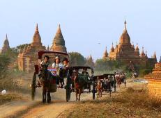 次はダマヤンジー寺院。5代目の王が建立。自分が即位したいために父と兄を殺害、罪の意識にさいなまれこの寺院を建立した。彼も殺されてしまったので、未完のままだという。どこの国にも似たような話がある。未完にしては細工も細かくて、寺院の形も変わっていて印象に残った。 これまではバス移動だったが、自動車道路がされていない所もある。パゴダが林立する平原を馬車の上から眺めた。現代の建物は一切なく、ここほど古都と呼ぶに相応しい所はないように思う。ビシッと鞭に打たれながら、馬はとぼとぼ歩く。爺さん婆さんの馬かもしれないと思うと、いたたまれない。