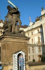バスでプラハ城へ。入り口には、青い制服を身につけた衛兵が立っていた。(左)。いずこも同じ、まばたきもしない。ここの衛兵も、体力があり見栄えのいい若者が選ばれるらしい。