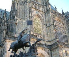 プラハ城は歴代王の居城。14世紀のカレル4世の治世に、現在の偉容が整えられた。城壁で囲まれた敷地には、複数の教会、旧王宮、修道院、博物館、美術館、黄金小路など見どころがたくさんある、大統領府もこの中にあり、執務中は旗があがる。この日は、白・赤・紺の国旗が靡いていた。