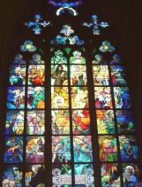 教会内には、チェコの画家で、アールヌーボーを代表するムハ(ミュシャ)作のステンドグラスもある。(左)。古めかしい図案が多いステンドグラスの中では、ひときわモダンだ。