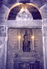 | ポーランド・チェコの旅 4 2003年8月11日(月) 「地球の歩き方」によると、ワルシャワからクラコフまでは、1等急行でも104ズロチ。わずか3000円ほど。社会主義時代の名残か、公共の乗り物は、だいぶ安い。こんなに安い国の場合は、1等車に乗りたかったが、旅行会社が選んだのは2等車だった。 Y夫妻、S夫妻と私たちの6人で、コンパートメントに座った。旧社会主義の国ゆえか、2等車ゆえか、お粗末な車両だった。オリエント急行を映画で見て以来、コンパートメントに憧れていたが、比較する気にもならない。コンパートメントは鍵をかけることも出来る。気心が知れた同士なら安全で楽しいかもしれないが、強盗犯と一緒の席にならないとも限らない。こんなことを考えると、個室は、必ずしも居心地はよくない。あ!これはアガサ・クリスティの「オリエント急行殺人事件」の読みすぎか? 幸い、Y夫妻・S夫妻とも実に気持ちのよい方で、話題も豊富。今回の旅に参加している方の旅行歴には驚くばかりだが、両夫妻とも地球を制覇しそうな勢いだ。ギニア高地でのハプニング、オーロラが毎日見えた話などに、聞き耳をたててしまった。 たまたまG球団が嫌いな人ばかり集まったこともあり、Gの横暴や、他チームの4番打者を金で引っ張ってくることへの怒りなどで、さらに盛り上がった。ツアーの場合は、下手すると、「日本」になってしまうから気をつけないといけない。でも、話の合間に見る車窓は、右写真のように、牧草地や畑が延々と続く平凡な景色だ。ワルシャワを8時40分の定刻に出発した列車は、予定通りクラコフに11時20分ころ頃到着。クラコフ駅から15`の地にある、ヴェイリチカという町のレストランに、バスで向かった。 昼食が終わった頃に、かわいらしい女の子が現れた。今日のガイド・パウリナさんだ。大学で日本語を学び、夏休みに、東京、京都、奈良を回ったという。「日本の夏は、蒸し暑くて嫌だったでしょう?」「ええ、暑かったです。でも、とっても面白かった」と言っていた。ワルシャワのエヴァさんとは大違いで、洒落た服装で垢抜けしている。特に刺繍のあるパンツがかっこ良かったので「ポーランド製?」と聞いてみた。「これはパリで買ったの。おばさんがパリにいるから、パリにはよく行く」とのこと。パリもウイーンも近いのだ。彼女からは、社会主義時代の暗さをまったく感じなかった。 ![]() 今日のお目当ては、ヴェイリチカ岩塩採掘場である。彼女はいつの間にか、黒っぽい制服のガイド姿に着替えていた。(左写真)。ガイドはヘルメットを被るが、私たちには貸してくれない。万一の時のヘルメットだろうが、客はどうなってもいいらしい。13世紀から岩塩採掘を始め、一時はポーランド王家の収入の3分の1も占めるほどだった。1950年代まで採掘していたが、採算があわなくなり、現在は土産用の塩だけを細々と掘っている。そのかわり、岩塩坑見学は、ポーランド観光の目玉だ。1978年に、世界遺産に指定されている。この日も、各言語のガイドごとに、たくさんの人だかりが出来ていた。 採掘場の前庭には、採掘者の像が立っていた(右上写真)。 労働者達であふれかえっていた全盛期のよすがとなっている。入り口は、ご覧のように、レストランとでも間違えそうなたたずまいだ。赤と白はポーランドの国旗。白は、白鷲を赤は夕日を表している。 まず地下64bまで、エレベーターで降りた。そこから、325bの地底まで歩く。広大な岩塩坑の一部を整備しているにすぎないが、それでも2.5km、2時間にもわたる見学だった。歩道も壁もすべて塩だ。試しに壁を舐めてみたら、当たり前だが、しょっぱかった。土が混じっているのかと思ったが、まぎれもなく、岩塩ばかりだった。 ![]() 見学者が退屈しないように、各所に採掘労働者の姿、ポーランドの伝説、王の像などさまざまな彫像が置いてある。もちろん岩塩製.。ここでもショパンはスターだ。ショパンの部屋もあるし、楽団の演奏も行われていた。イエスとマリア像が多いのも、地上と同じである。(右上写真) 圧巻は、採掘後の空き地を利用して作った広い礼拝堂だ。(左上写真)。大きなシャンデリアが下がり、祭壇もある。実際に、ここで、日曜には礼拝が行われているそうだ。塩の結晶で作られたシャンデリアが、暗い坑内でキラキラ輝いていた。 距離にすればたいしたことがないが、ガイドについてゾロゾロ歩くのは、自分勝手に歩くのとはわけが違う。珍しくて面白い地下探検ではあったが、長旅の疲れが出始める頃でもあり、地上に出たと時は、ほっとした。(2004年10月15日 記) 感想・要望をどうぞ→ ポーランド・チェコの旅1へ 次(クラコフ)へ ホームへ |