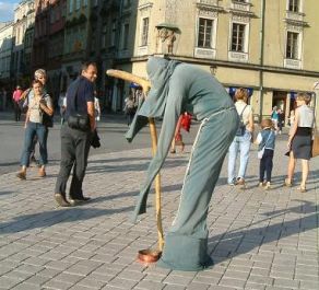 旧市街にある広場は、中世の広場としてはヨーロッパ最大だという。ここにも、見せ物がいた(右)が、芸をするわけではないので、乞食みたいなものだ。でもユーモラスな動きが、彩りをそえている。