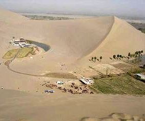 三日月形の泉・月牙泉は、麓からは月の形に見えなかったが、頂上から見ると、たしかに三日月の泉(左)だ。2000年前から湧いているが、次第に小さくなっているという。水は、わずかしかなかった。