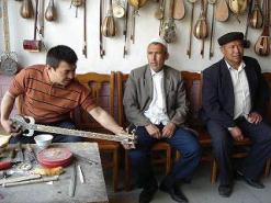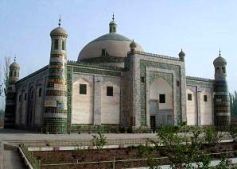 | 中国シルクロードの旅 7 4月23日(土)−6日目 今日はカシュガル市内を見物する。新彊ウイグル自治区の東に位置するウルムチは、漢民族が多くなり、他の中国の都市とさして変わりはない。しかし、西に位置するカシュガル(シルクロードの旅1の地図参照)は、ここが中国だということを忘れそうな都市だ。 住民のほとんどがウイグル族のイスラム教徒だけに、看板は、漢字とアラビア文字が併記されている。はじめて中国を訪れた時に、チョコレートの箱に、簡略漢字以外に、アラビア文字が書いてあり不思議に思ったが、今回の旅で謎が解けた。 まずアバク・ホージャの墓(左)に行った。イスラム教白帽派の有名な指導者であるアバク・ホージャとその家族(5代72人)の陵墓。乾隆帝の寵愛を受けた一族の香妃が、葬られていることから、香妃墓とも言われる。「北京からここまで遺体を運ぶ筈がないから、遺骨はないだろう」と、ガイドのアブドさんは、つぶやいた。 創建は1670年、1874年の大規模な修復で、中央アジア式イスラム陵墓になった。緑のタイルの円形屋根、4隅に建つ尖塔のモザイクは、イランで見たのと同じように華麗だ。 エイティガール寺院に行く途中、職人街をゆっくり歩いた。職人街とついてあるだけあり、単なる商店街ではない。職人が、金物、木工製品、帽子、楽器、衣類などを実際にその場で作っている。 ここがいちばんイスラムを感じる場所だった。写真撮影は構わないと聞いたので、断らずに、写真をごく近くから撮ることができた。男性はみなウイグル帽をかぶり、顔をベールで隠した女性もチラホラいる。ベールは茶色だ。黒や白のベールは、あちこちで見たが、茶色ははじめてだ。ぶらついているのは、圧倒的に男性が多い。女性が強いと言われる中国だが、やはりここはイスラム社会の掟があるのだろうか。