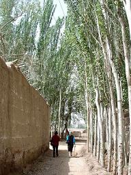 エイティガール寺院は、西域最大のイスラム寺院である。1422年に創建。ここも、イランで見た寺院とよく似ている。イランのハタミ元大統領も訪れたことがあるそうだ。金曜の礼拝には、男性信者が5000人ほど集まり、祭りの時には、5万人が道路まで埋め尽くすという。今日は、土曜日。祈る人が訪れている様子はなかった。ラマダンの断食も、信者の70%は忠実に実行するそうだ。 カシュガル滞在は2日間だったが、滞在中にアザーンが聞こえてくることもなければ、祈る人を見かけなかっただけに、アブドさんの説明を聞かなければ、熱心な信者がいることは、知り得なかった。 「次はきれいなトイレがある所に行きます」とアブドさんが言うのでどこかしらと期待を持ったが、ショッピングセンターだった。買う物がないので、街並みを眺めていた。野菜を積んだ荷車を引くおじさんもいれば、馬車も頻繁に通る。ここでは、馬車がマイカーなのだ。 その後は、バザールに向かった。バザールもイスラムの国を何度も訪れるうちに、感動も薄れてくる。アブドさんが連れていってくれた店(左)でナッツ類を買った。 平均月収が2万円以下のカシュガルのバザールにしては、すべてが高い。「デパートの方がもっと安かった」とIさんが言う。スルーガイドの張さんに「バザールの方が高いなんて変じゃない?」と言ったら「彼らは人を見ますからね。現地の人には、安く売りますよ」という答えが返ってきた。張さんは、ガイドでいながら、こんなことを臆面もなく口にするが、人柄は憎めない。 昼食は、市内の民家・マイマイティ家で。カシュガルで私がもっとも印象に残っている風景は、まっすぐ伸びたポプラ並木だが、マイマイティ家も、ポプラで囲まれた素晴らしいロケーション(右)にある。