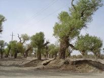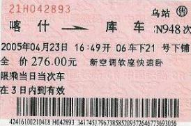 | 中国シルクロードの旅 8 2005年4月24日(日)−7日目 右は、カシュガルからクチャまでの鉄道切符。「空調が効いていて、速くて上等な座席」ということが、読み取れる。漢字文化は有り難いものだ。 駅には、クチャのガイド・宋丹丹さんが待っていた。宋さんは24歳の満族の女性。パンダの名前みたいで可愛い。中国北東部(日本が満州と呼んでいた地方)の大学を出て、両親もそこに住んでいる。「恋人がコルラで働いているので、クチャでガイドの仕事を見つけました」と、明るく話す。クチャとコルラは300キロぐらい離れている。クチャと中国北東部は、もっともっと離れている。近い所に仕事がなかったのかなあ。 クチャのホテルで仮眠をとった後、朝から観光だ。クチャは、綿花と石炭が主産業。日照時間は夏が16時間、冬でも10時間もある。雨が降らないので、天山山脈の雪解け水を使っている。 市内からおよそ200キロのタクラマカン砂漠へ向かった。クチャからニヤまでは、砂漠公路(右)という立派な道路が通っている。 砂漠公路の入口に、大きな看板があった。「砂漠の海が石油の海に変わる」。中国は、スローガンが大好きだが、実際に、政府はこの付近に多くの労働者を送り込み、石油を掘っている。石油の海になる夢は叶うのだろうか。
