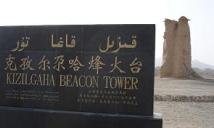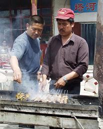 ちなみに、「胡」は、西から来たものという意味で、胡人、胡麻(ゴマ)、胡桃(クルミ)、胡瓜(キュウリ)など、シルクロードには、胡のつくものが多い。 砂漠のレストランで、拌面(ラグメン)とシシカバブの昼食。焼きたての羊(右)のシシカバブは、とてもおいしかった。帰国後にラム肉を同じように焼いてみたが、この時の味とは、遠かった。 同じ道をクチャに戻り、ホテルで少し休憩。郊外のクズルガハ烽火台と、クズルガハ千仏洞に向かった。 クチャは、古くは亀茲国(きじこく)が栄えた地で、前漢に登場したオアシス国家。後漢の時に西域都護府、唐の時代には安西都護府が置かれ、10世紀頃まで繁栄した。 まず、クズルガハ烽火台(左)へ。高さ13bの烽火台が残っている。狼煙や松明を使ったという。何もない茶色の世界に、門番として、住み込んでいるお年寄りがいた。家族は逃げてしまったというが、無理もないなと思う場所にある。 感想・要望をどうぞ→ 中国シルクロードの旅 1へ 次(キジル千仏洞と楼蘭の美女)へ ホームへ |