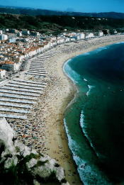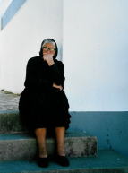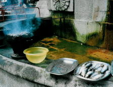 ポルトガルの旅 4 ワイン、カステラに続き、今回も食べ物。ナザレ名物「イワシの炭火焼き」について、お話します。ナザレと言うと、イスラエルのガリラヤ地方の小さな村が本家本元ですが、ポルトガルにも、同じ名前の町があります。右写真は、裏町の道路際で見た炭火焼き風景。皿には生きのいいイワシ。左のコンロからは、もうもうと煙が。小さな港町ナザレのホテルでとったディナーは、イワシの炭火焼きでした。 こんな庶民的な食べ物を「ナザレ名物・イワシの炭火焼き」と名乗るなどおこがましくないのか・・と思うものの、肉と干しダラ加工品ばかり食べてきた身には、ことのほか美味しく感じました。「あつあつのご飯と醤油があればねえ」と、つぶやきながらも。 ナザレは漁村として有名です。ガイドブックには、「海を眺める漁師の後ろ姿」が、詩的に写っていました。私もこんな写真を撮りたいものだと、張り切って海岸を散歩しましたが、訪れた時は真夏。パラソルと海の家ばかりで、寂しい港町を思わせる景観は皆無でした。左は、高台から見下ろしたナザレの海岸。小さいゴミのようなものは人、人、人。![]() 海岸で裏切られたナザレは、裏町を散歩することによって、ワクワクするものになりました。この光景を目にしただけで、ポルトガルの旅は二重丸です。細い露地には洗濯物がひるがえり、かたわらの路上ではイワシ焼き。民族衣装のおばあさんは、おしゃべりに夢中。 右写真は、もの思いに耽るお年寄り。30分以上も同じ姿勢でした。おしゃべりするおばあさんあり、思索的なおばあさんあり。 左下の写真は、ひとさまに誉められたので、大きく載せます。2人が立つと、道が塞がってしまうほどの細い露地でのスナップ。 葬式帰りではありませんよ。未亡人は、年がら年中、黒い衣服を着る慣習になっています。スカーフから靴下まで見事に黒で統一されていました。朝8時頃。特別な所へのお出かけでもなさそうですが、キマッテいますね。ところが、夫持ちの人は、たとえ80歳になろうが、花模様のブラウスに短い格子柄のスカート。スカートは重ね着ですって。市場で元気よく働いていたご婦人の服装は、下の写真のように、派手派手。 市場の店員に、黒ずくめはいませんでした。未亡人は、働いてはいけない・・の決まりでもあるのでしょうか。誰にも聞けずじまい。ご存知の方は教えてください。これほど対照的な衣装は、なぜでしょうね。ご多分にもれず、若い人は、誰も民族衣装を着ていません。10年もすれば、漁師の町にまつわる民族衣装も消えてしまいそうですね。(2003年9月17日 記) 読んでくださった方から、18日に、次のような情報が寄せられました。 漁師のおかみさんは,衣装を何枚も重ね着するそうです。ご亭主が何日もかかる漁にでると,1日終わるごとに1枚づつ脱ぎ、ご亭主が帰港するときには最後の1枚になると現地のガイドに聞きました。切なくてちょっとと艶っぽい話です。ご存知でしょうが念の為・・・。 重ね着に、こんな艶っぽい背景があることは知りませんでした。実際に重ね着衣装はお年寄りだけだったので、艶っぽさは、みじんもありませんでしたよ。漁師の町だけに、信じましょうか。 (2003年9月18日 記) 感想・要望をどうぞ→ ポルトガルの旅 1へ 次へ ホームへ |