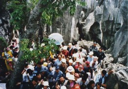 昆明から南東へ100q行った地にある石林は、鋭い石がまるで剣のように林立しています。有名な観光地は、期待が大きくて裏切られる場合と、評判に違わぬ感動を得られるかのどちらかですが、今回は前者。日本のゴールデンウイークの頃は、中国でもメーデーがらみの連休だとか。中国の人口は13億人。そのうちの1割が旅行しても、日本民族全員が移動しているようなもの。押すな押すなの大混雑は、この写真でおわかりでしょう。